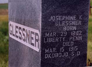 was March 15, 1915. In those days, the neighbors laid out the bodies of their good friends. Mrs. Bunch came and helped Aunt Kitty prepare Grandma's body for burial. Then her body was put on a door and carried into the living room to await the undertaker, who came the third day. Fortunately, the weather was cold. I don't remember the funeral, which was held in the living room, and I don't remember looking in the casket, although I'm sure I did. I do remember following the black hearse, drawn by two black horses, to the cemetery. She was buried there on the prairie, which she had held in awe and some fear all the days she had lived in Dakota. |